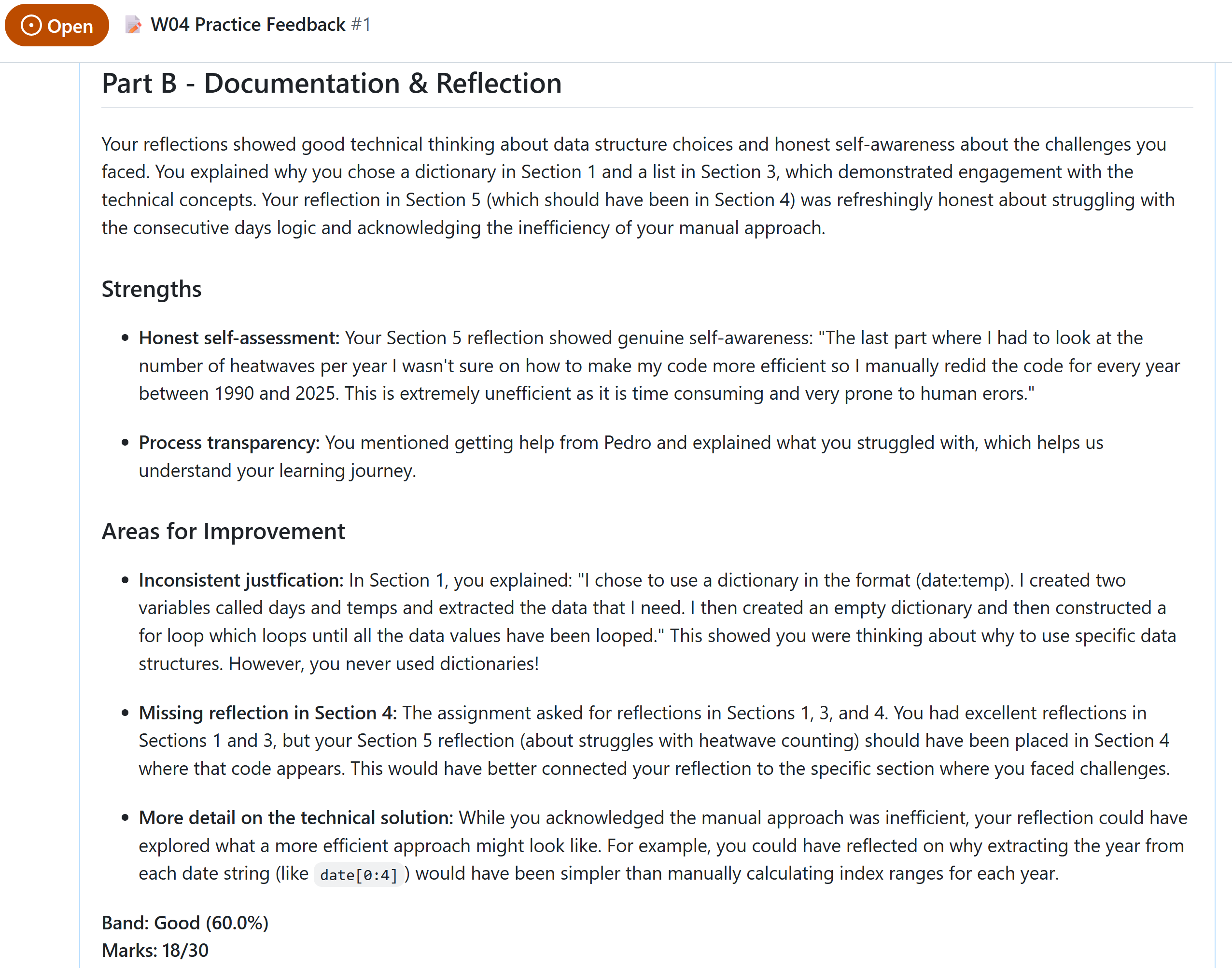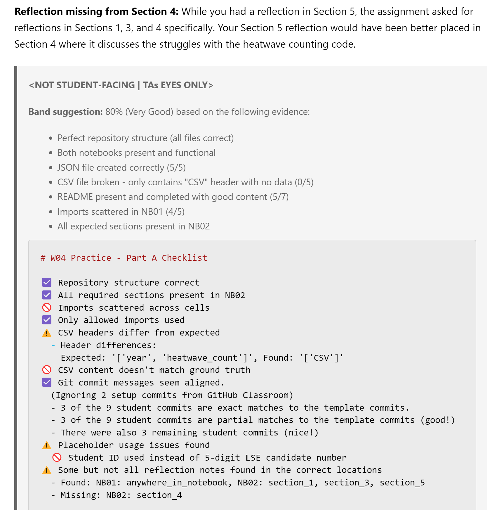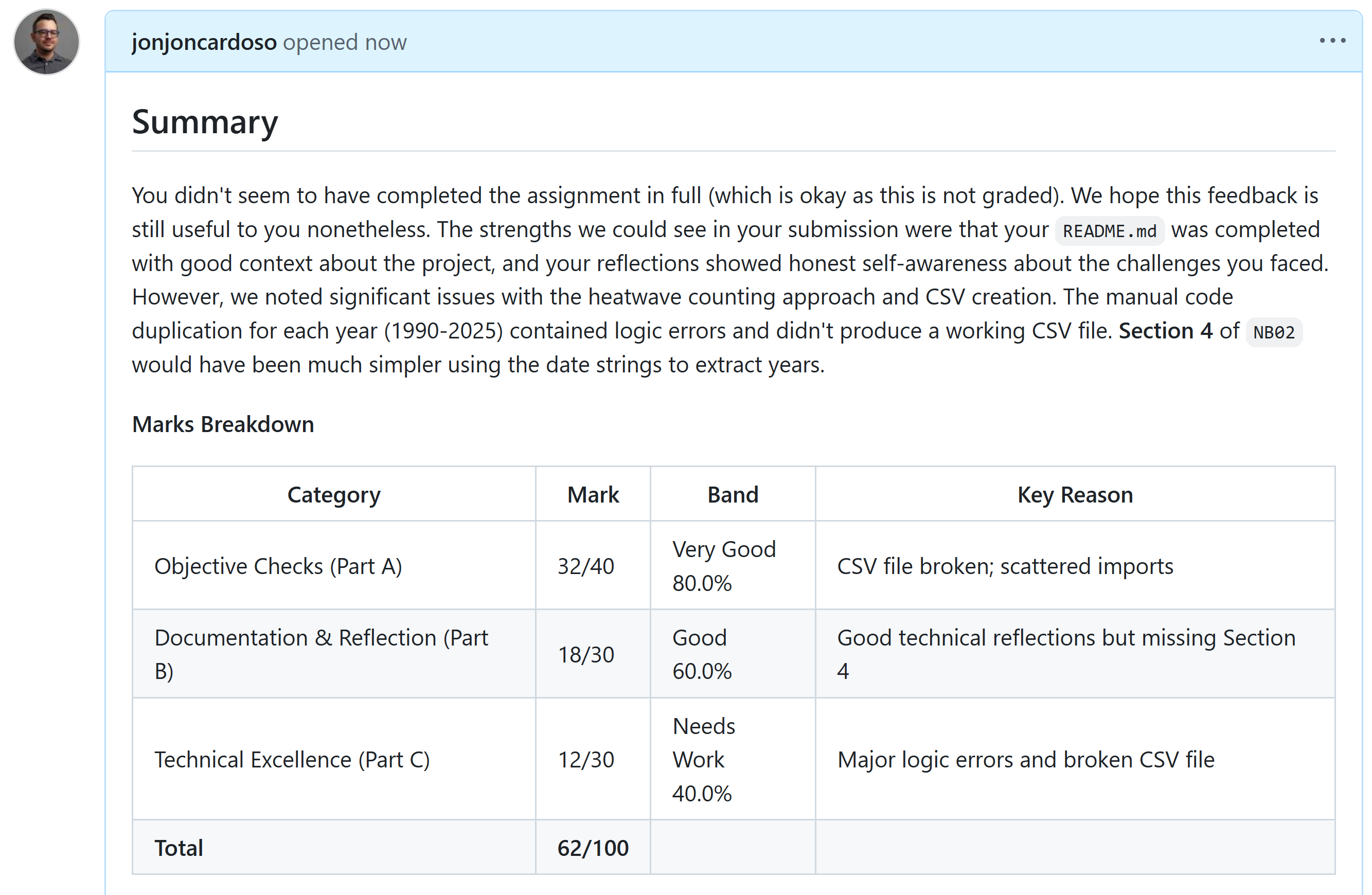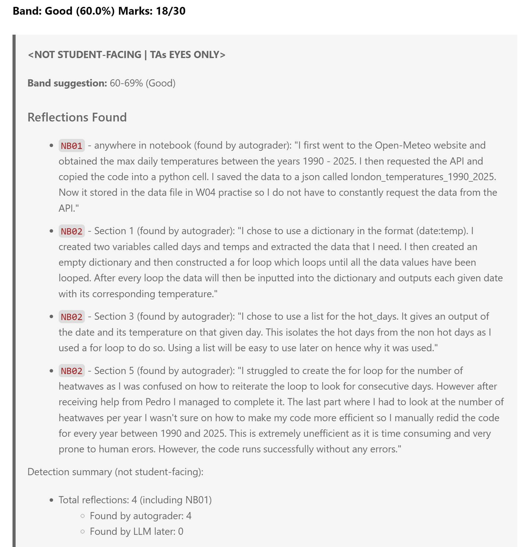 The draft was a very useful pointer for marking. It was particularly helpful for things like checking commit history, and picked up on small details that I may have missed, like the formatting of sections and file names - it picked up that there was an error because of extra spaces in the file name. I was actually very impressed by the ability to pick up on every small detail. It’s also really helpful for setting guidelines with marks and bands.