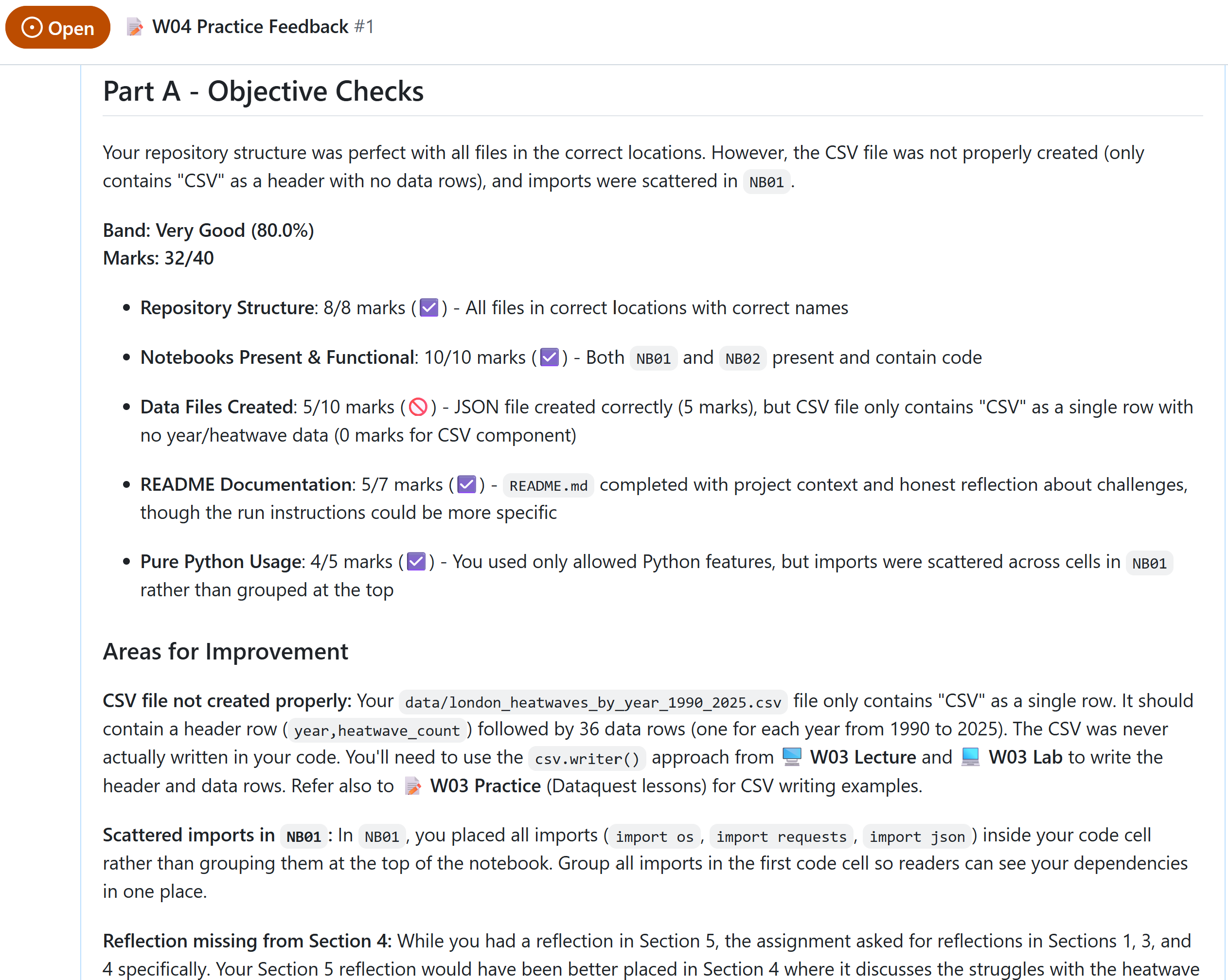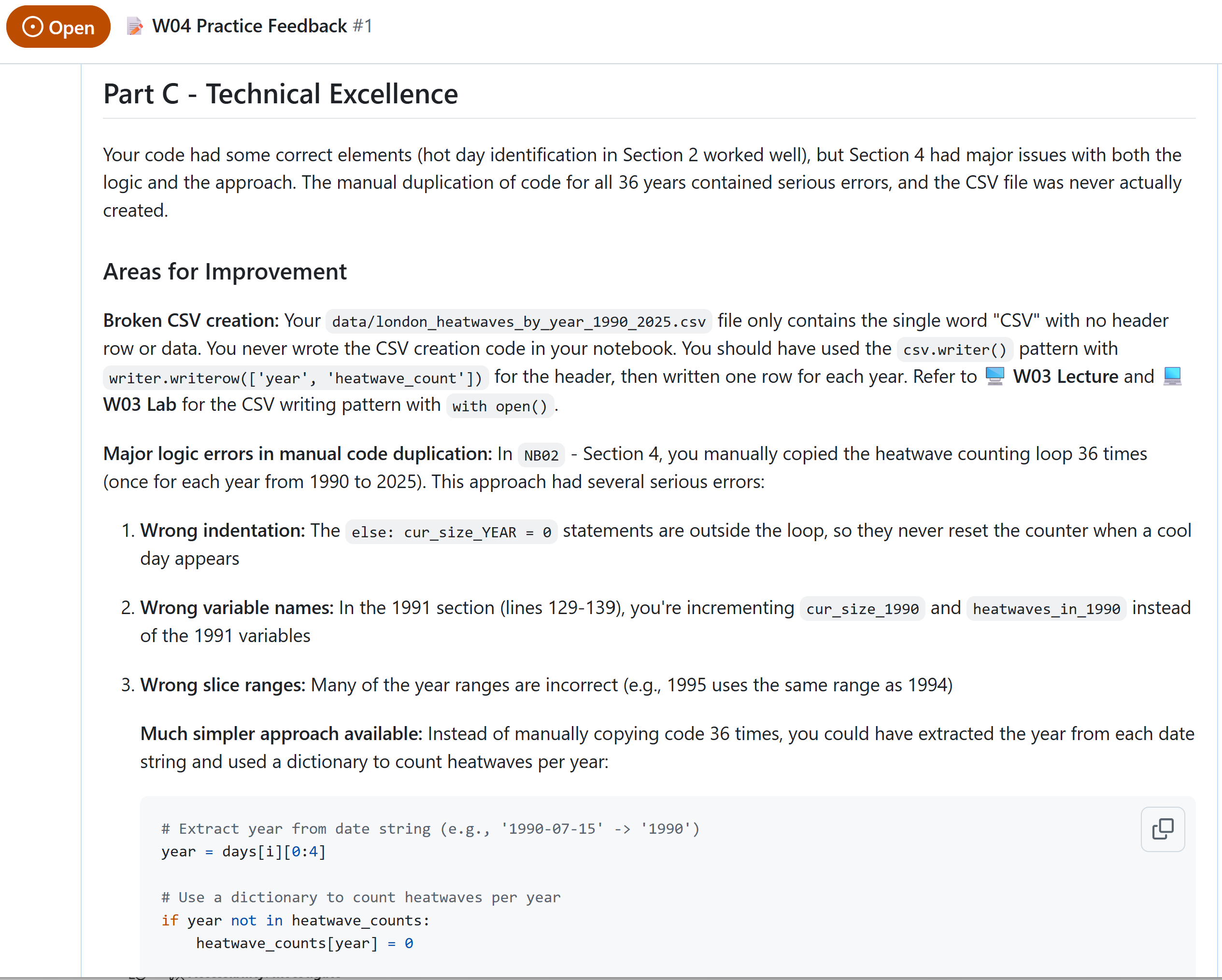 📝 **W04 Practice** focuses on building confidence with Python fundamentals. Using {{FORBIDDEN_TOOLS_LIST}} bypasses the learning process and suggests you may not be engaging as much as you could with the teaching materials we have in lectures and labs. This is reflected in your Part C marks.