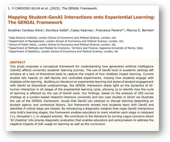 Cardoso-Silva, J., Sallai, D., Kearney, C., Panero, F., & Barreto, M. E. (2025). Mapping Student-GenAI Interactions onto Experiential Learning: The GENIAL Framework. SSRN Electronic Journal. Available at https://papers.ssrn.com/sol3/papers.cfm?abstract_id=5674422